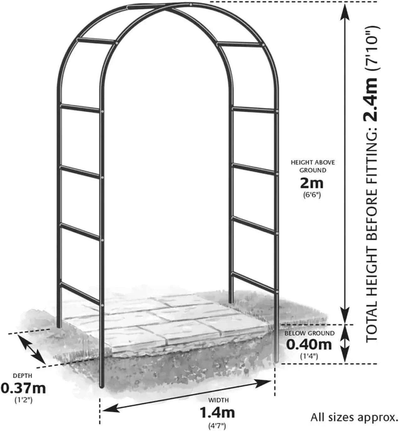 • ๐—˜๐—Ÿ๐—˜๐—š๐—”๐—ก๐—ง ๐Ÿฎ.๐Ÿฐ ๐— ๐—˜๐—ง๐—ฅ๐—˜ ๐——๐—˜๐—ฆ๐—œ๐—š๐—ก: Standing tall at 2.4 metres, this garden arch adds height and elegance to any setting, becoming a striking focal point in your lawn, patio, or courtyard.