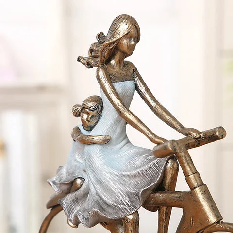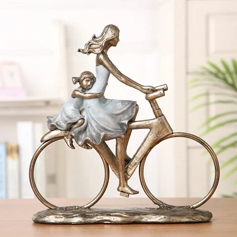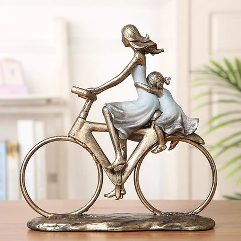 The figurine portrays a family moment where the father, mother, and daughter are enjoying a bike ride together, symbolizing unity and affection.  Constructed from premium resin, the figurine is sturdy, with meticulous attention given to the tiniest elements for a realistic look.