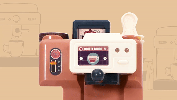 Interactive and operational coffee machine! Fill the top with cold water and watch as it filters down into the cup below. Various sound effects will enhance the experience as you use the machine, including sounds of a coffee grinder, water pouring, and cash register beeps!