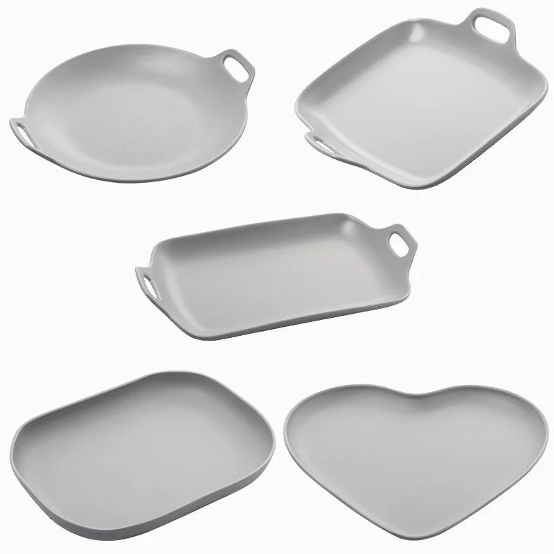 - Discover this 5-piece set of farmhouse-style melamine trays that are both durable and stylish. Available in gray and black, each set includes a round tray with handles, a square and rectangular tray with handles, a tray with rounded corners, and a heart-shaped tray.
