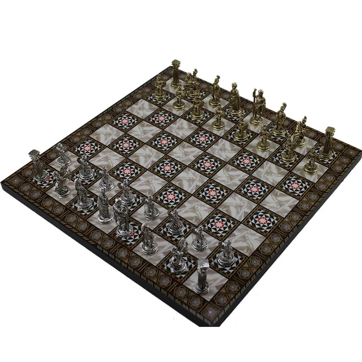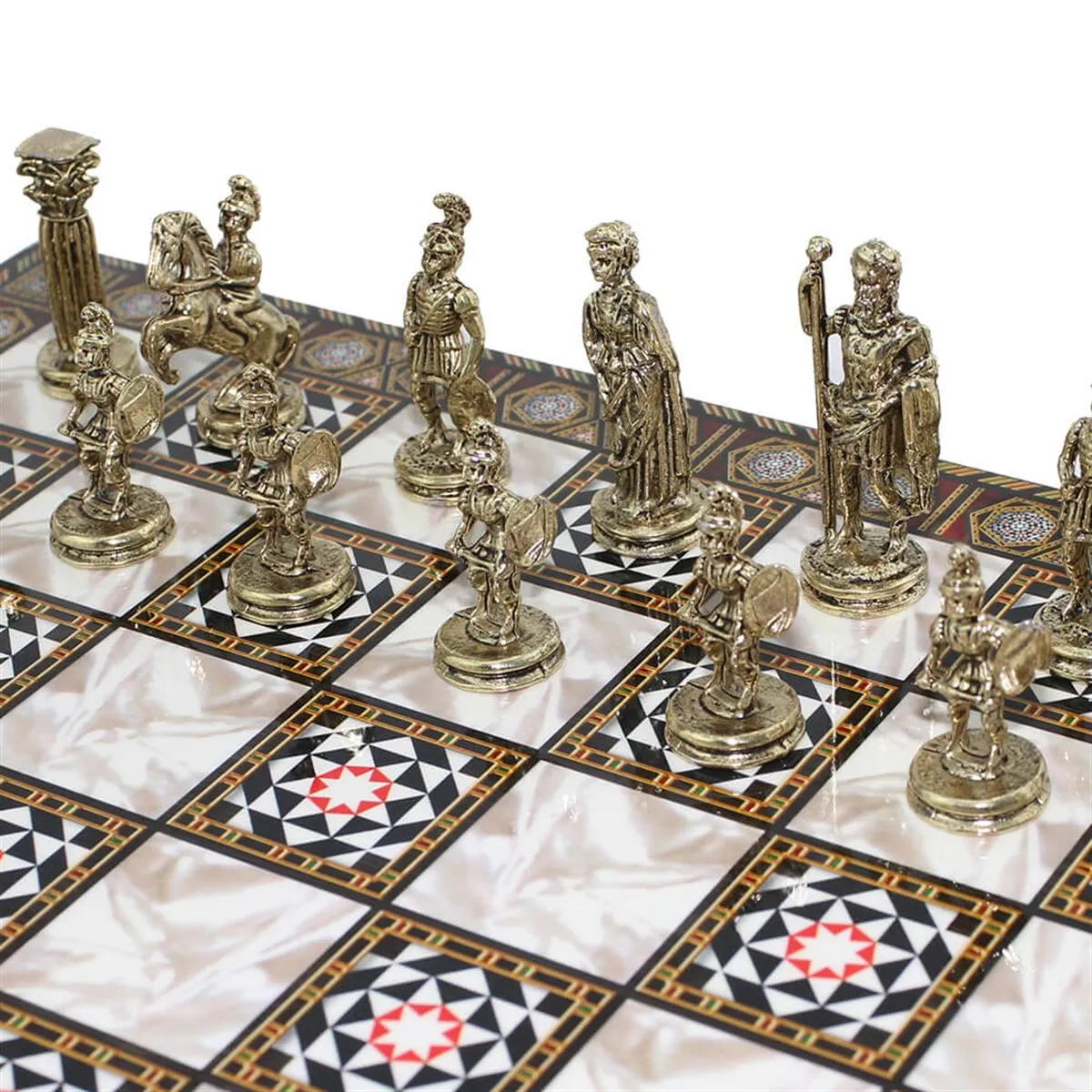 ✔MOSAIC PATTERNED WOOD CHESS BOARD. This chess borad is made of 12mm, 1st quality MDF board. There is on the mosaic of desing MDF wooden chess board. ✔HOW CHESSBOARD LOOKS AMAZING. After the pattern is made on wood, all surfaces of the product are protected with 3 layers of elephants varnish and 3 layers of glossy polyester varnish. ✔DIMENSION OF CHESS BOARD. 30x30x1,2 cm ✔HIGH QUALITY UNIQUE CHESS PIECES. Figures of Metal Chess Sets are manufactured in Turkey with high quality workmanship and handmade with special coatings and paint over the first grade and molding materials. ✔MACNIFICENT ROMAN SOLDIERS. Chess pieces describe Roman soldiers and their period. ✔KING HEIGHT IS ABOUT. 4.8 cm ✔KING WEIGHT IS ABOUT. 18G ✔PAWN HEIGHT IS ABOUT. 3 cm ✔PAWN WEIGHT IS ABOUT. 8g ✔EFFICIENTLY USE AND TO NON-DAMAGE YOUR FURNITURE. Chess board has 4 pieces of non-slip bonding to the back surface of the product. ✔WE ARE USING ZINC ALLOY AS A MOLDING MATERIAL. Zinc alloy is a metal alloy and its mains components are zinc, aluminum, magnesium and copper. ✔MAKE THE PEOPLE YOU LOVE HAPPY. It is not just a game it is also a very nice cool decoration object and a great gift. NOTE: Sometimes there may be slight changes in the figures without changing the main theme.