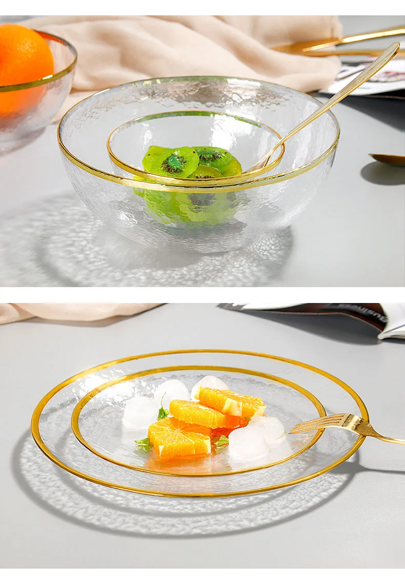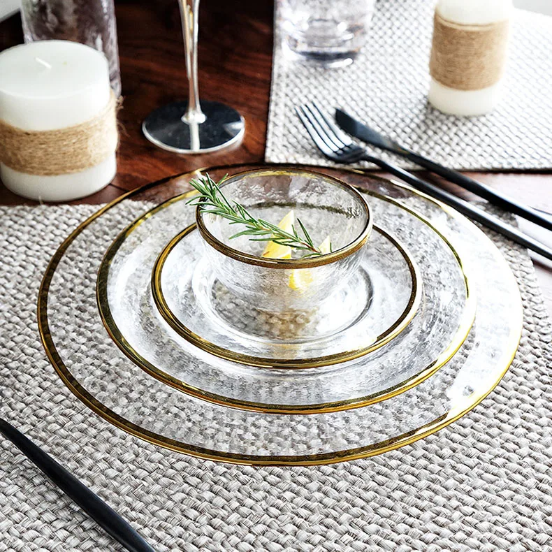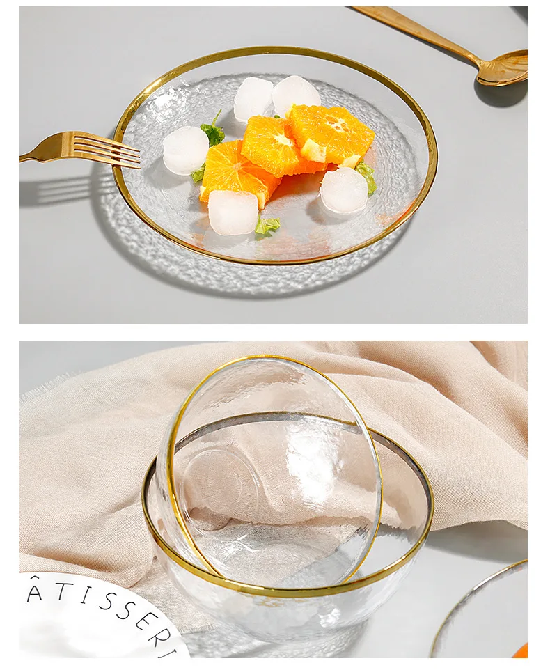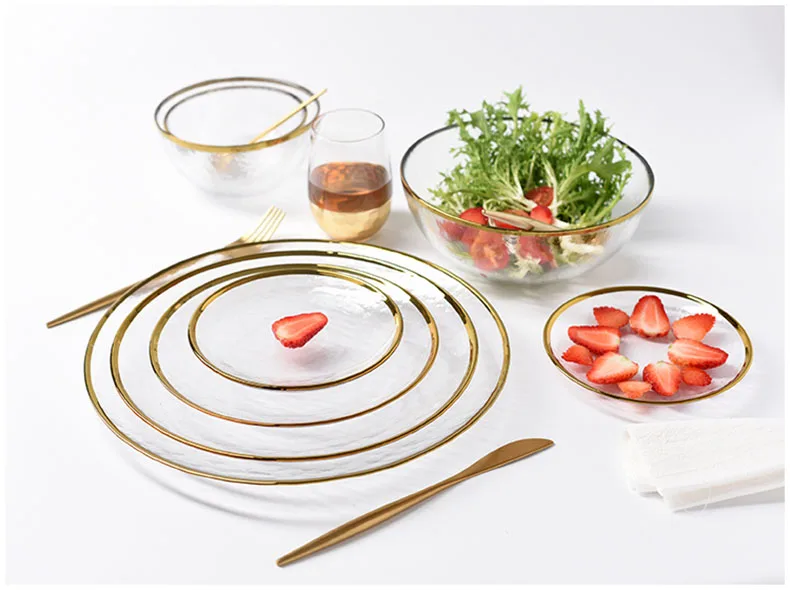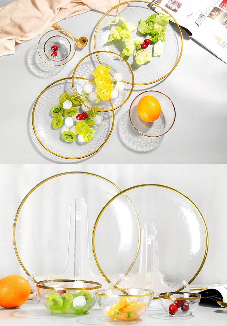 With this gold trim glass tableware, serving food is a breeze. Made with durable glass and featuring an elegant gold rim, these utilitarian-yet-upscale plates and bowls help you create memorable food displays. Use them for personal meals, the family dinner table, or a diner or cafe. These plates and bowls make excellent gifts too!