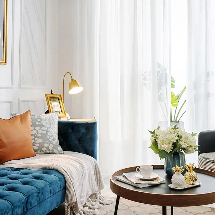 The Kira White Cotton Blend Sheer Tulle Curtains combine a soft cotton texture with the durability of polyester. These curtains are designed to provide privacy while subtly filtering natural light, creating an airy and inviting atmosphere in your home.