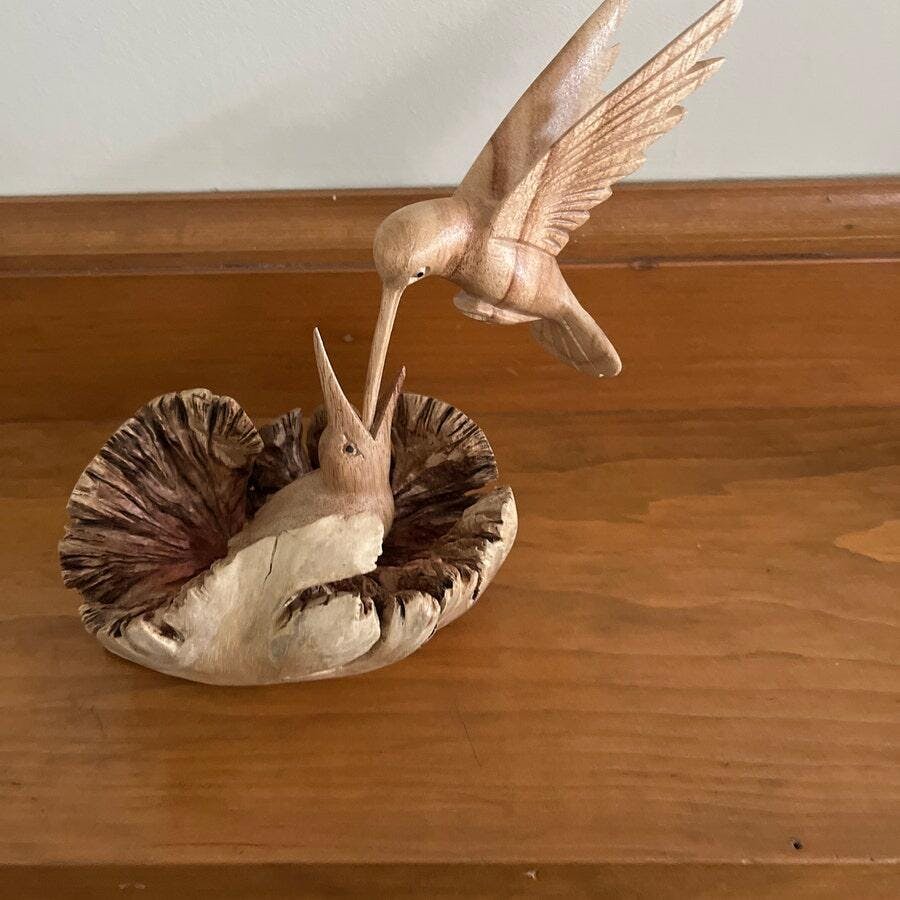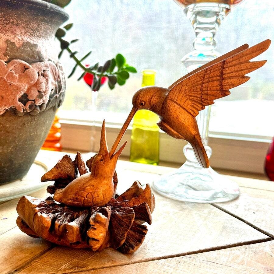 This captivating hummingbird sculpture is a delightful piece of handcrafted art. Expertly carved from jempinis wood and featuring a striking, naturally textured base, this piece showcases the beauty of natural materials and skilled artistry. The clear coat finish enhances the wood’s natural tones, highlighting the intricate detail of the hummingbirds in flight. It’s a perfect gift or a stunning addition to your home décor.