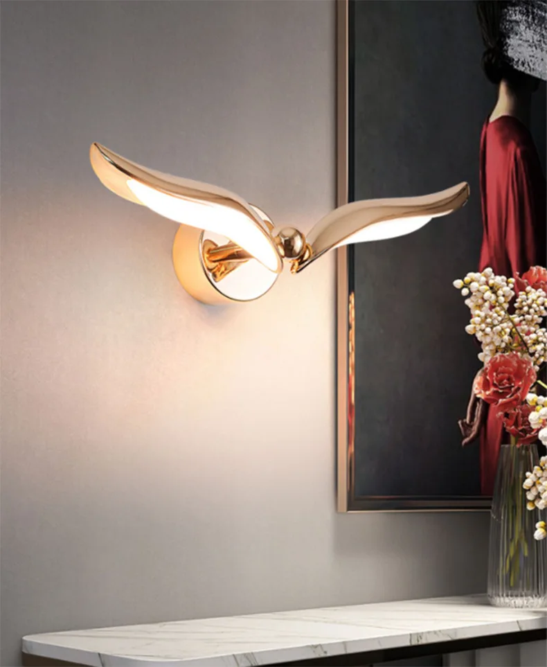 Experience an atmosphere of calm and allure with this lamp, drawing inspiration from the graceful form of birds. Enhanced by its intricate outline and gentle bends, this wall sconce brings an element of sophistication and peace to any space.