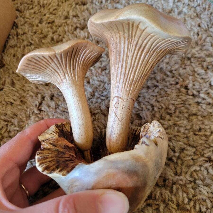 This enchanting mushroom sculpture is a delightful addition to any home, making a perfect gift for nature lovers or anyone who appreciates handcrafted items. Meticulously carved from jempinis wood, it features a cluster of mushrooms nestled on a uniquely textured base. The natural wood grain is beautifully highlighted by a clear coat finish. Each piece is unique, reflecting the beauty of the natural materials.